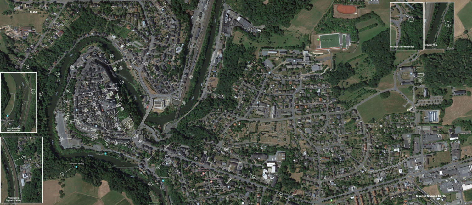 Stadtplan von Weilburg mit Kennzeichnung der „Inschriften“. Der Plan kann als PDF-Bild-Dokument aufgerufen und vergrößert werden.