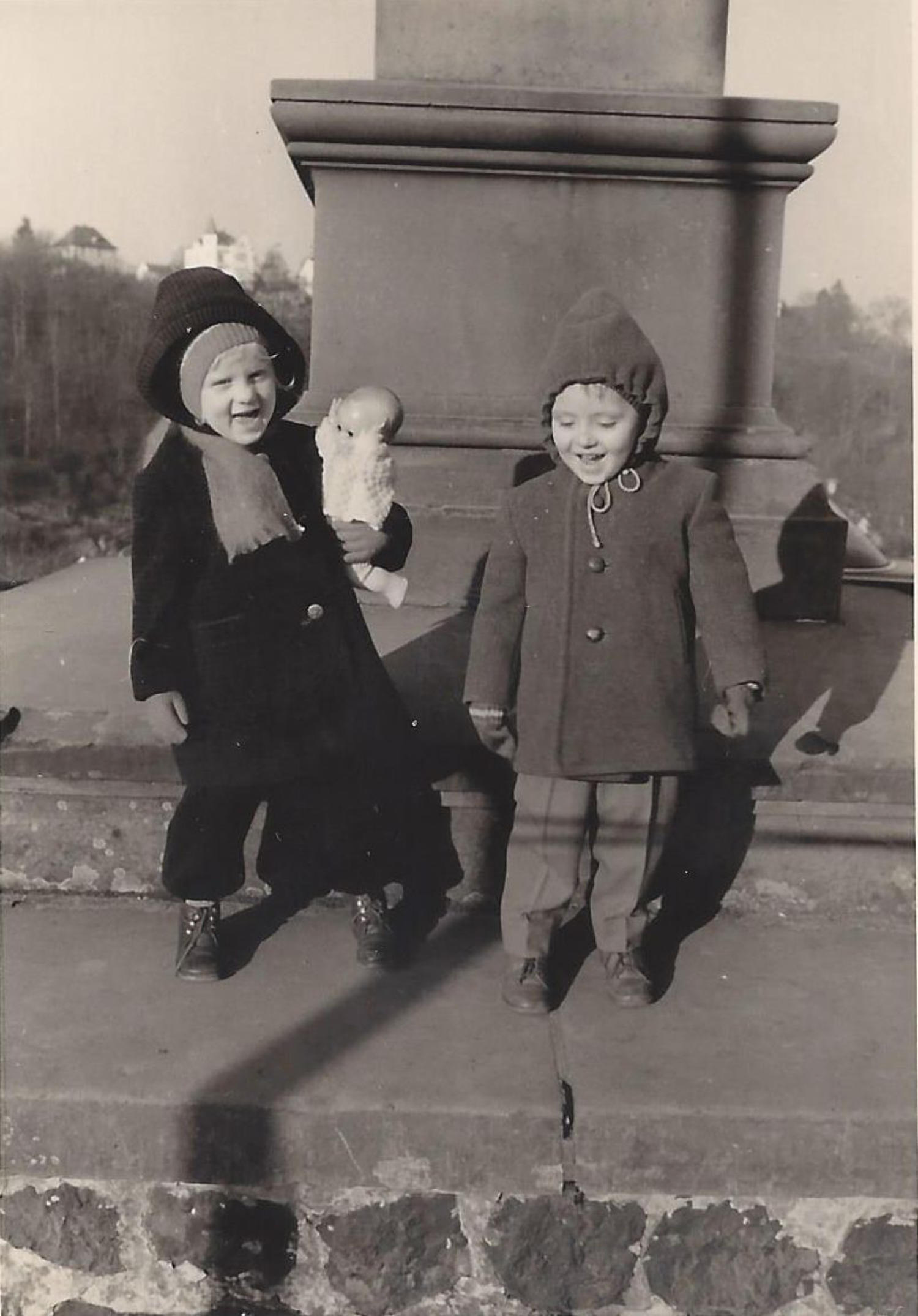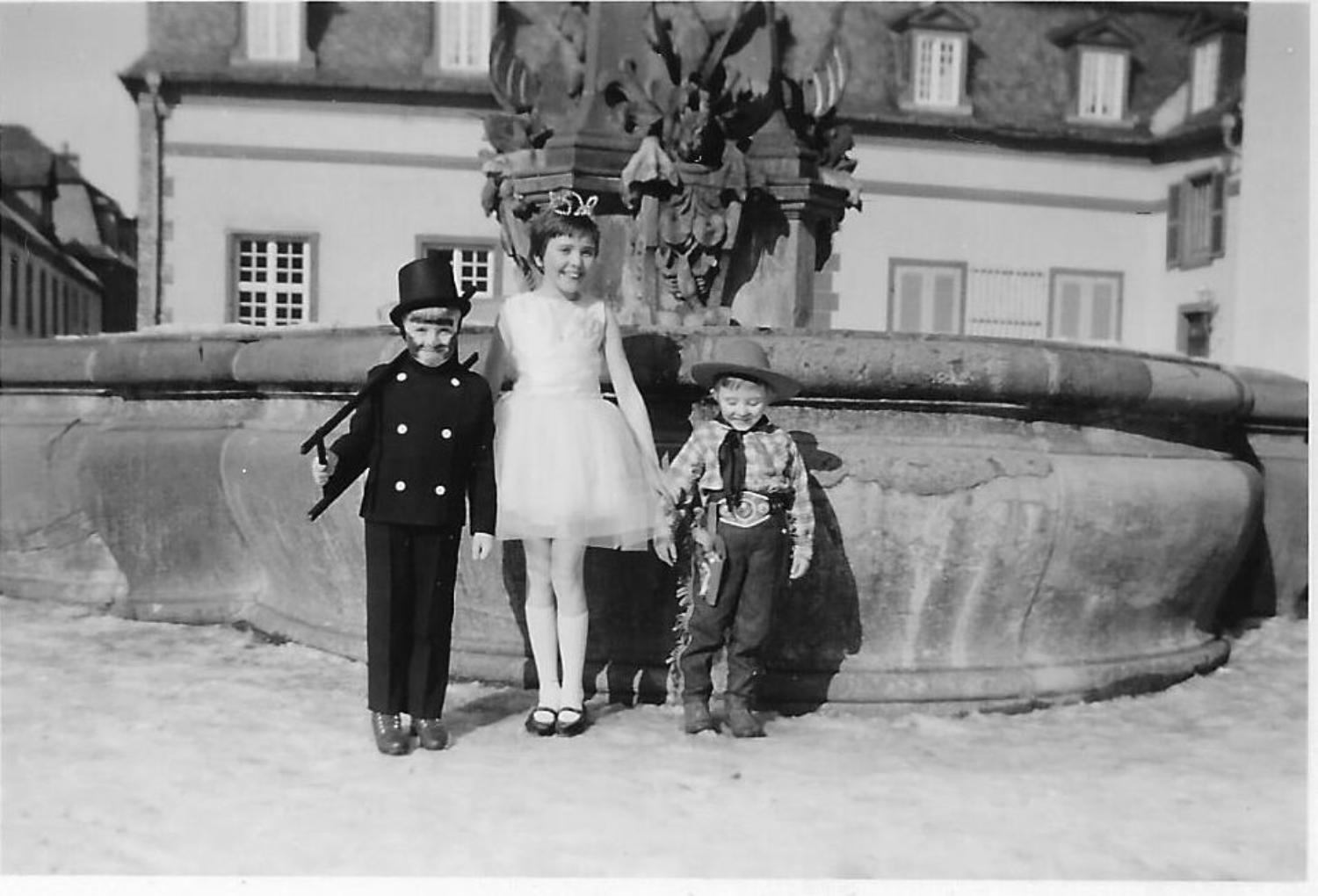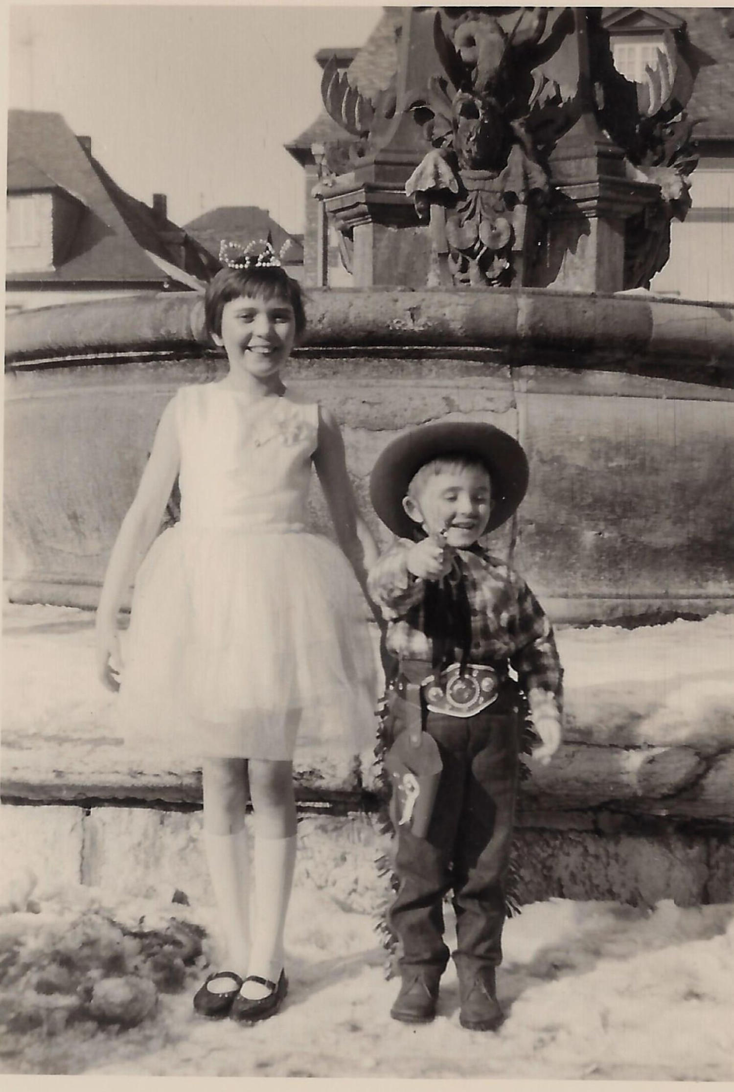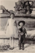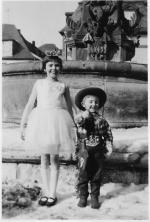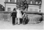 Schwester Karin und kleiner Rainer am Neptun-brunnen auf dem Marktplatz