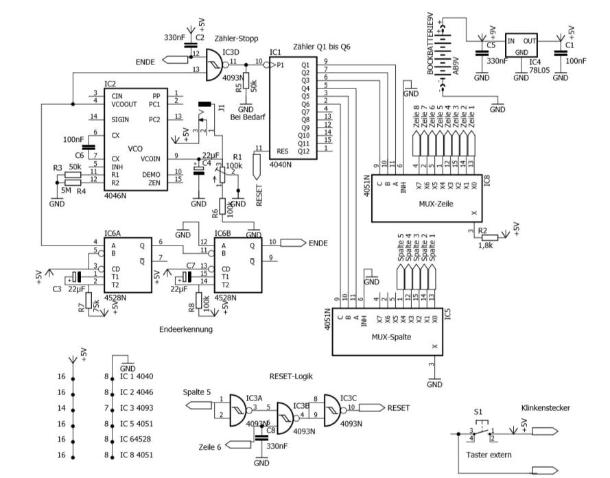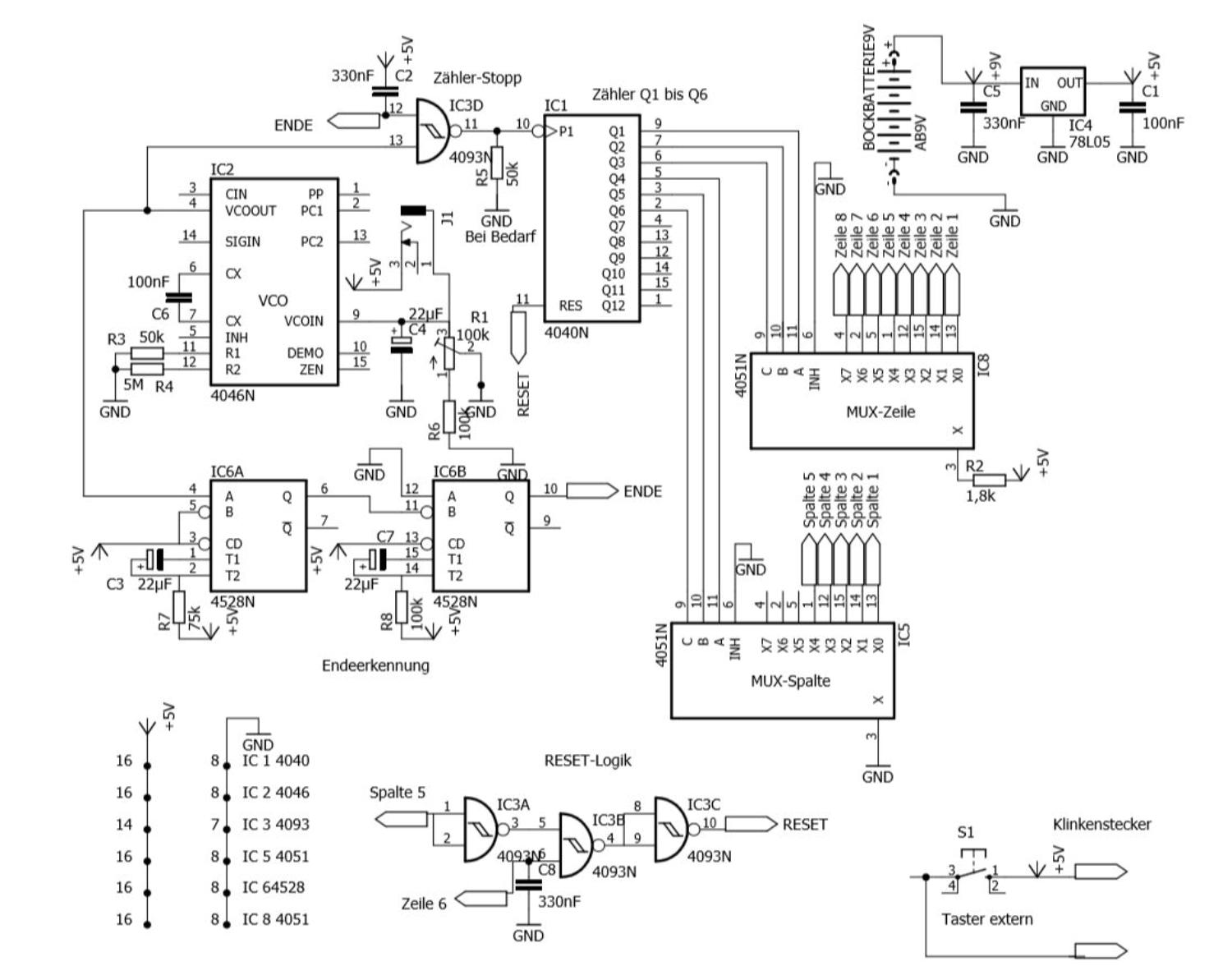 The power supply is provided by a 9V block battery. The voltage is stabilized via IC 4 (78L05). The input voltage of IC 4 can be up to 30 V according to