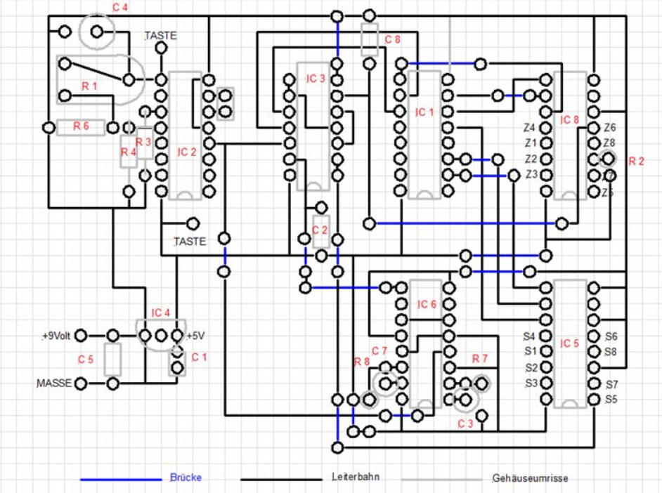 Should the running light run on its own after switching on, the resistor R8 ( PIN 14 IC 6) must be increased at the Monoflop.