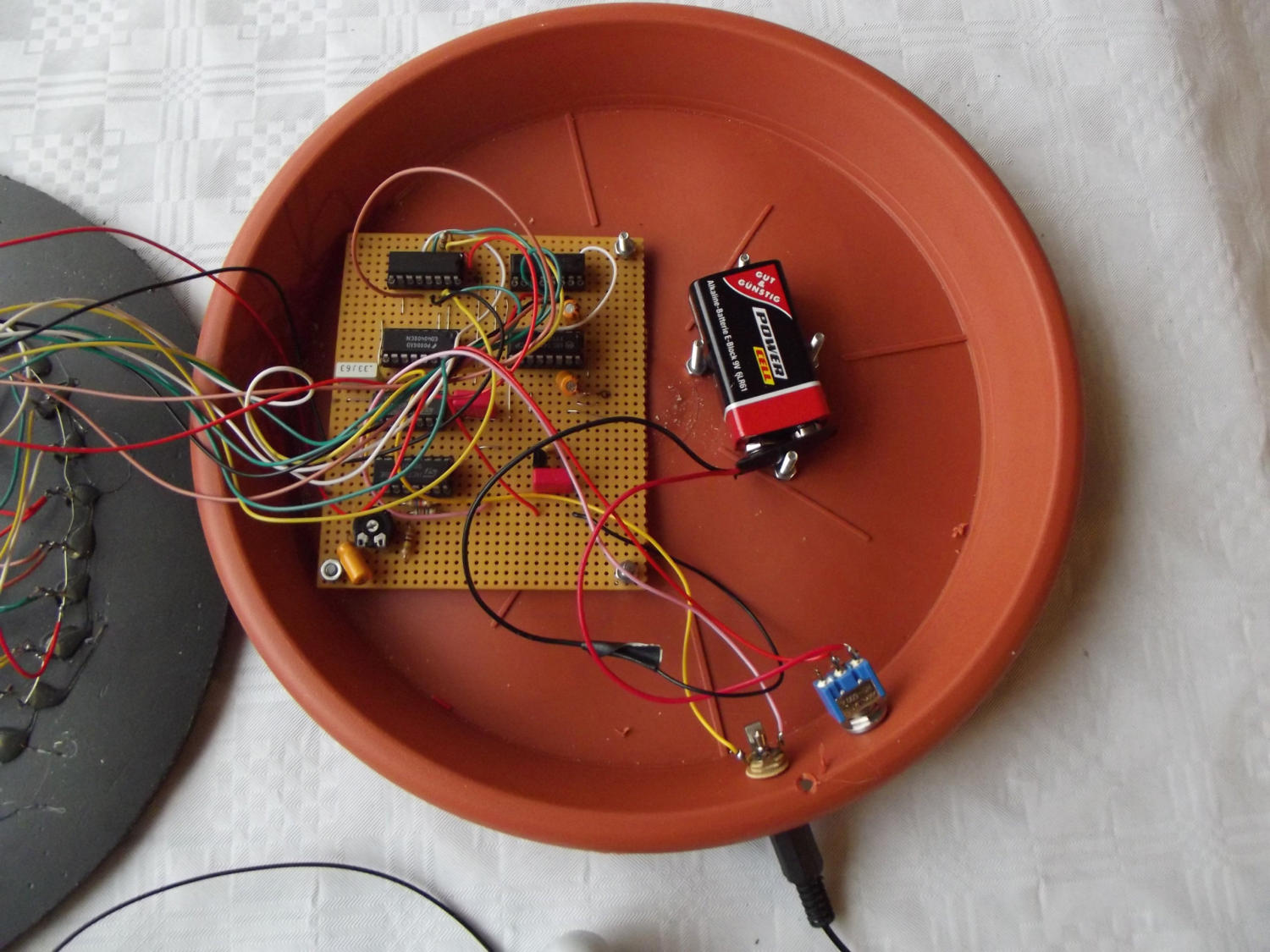 electrolyte capacitor with a parallel connected trim potentiometer to the control input pin 9 of IC 2 (4046) is connected. The button for starting the