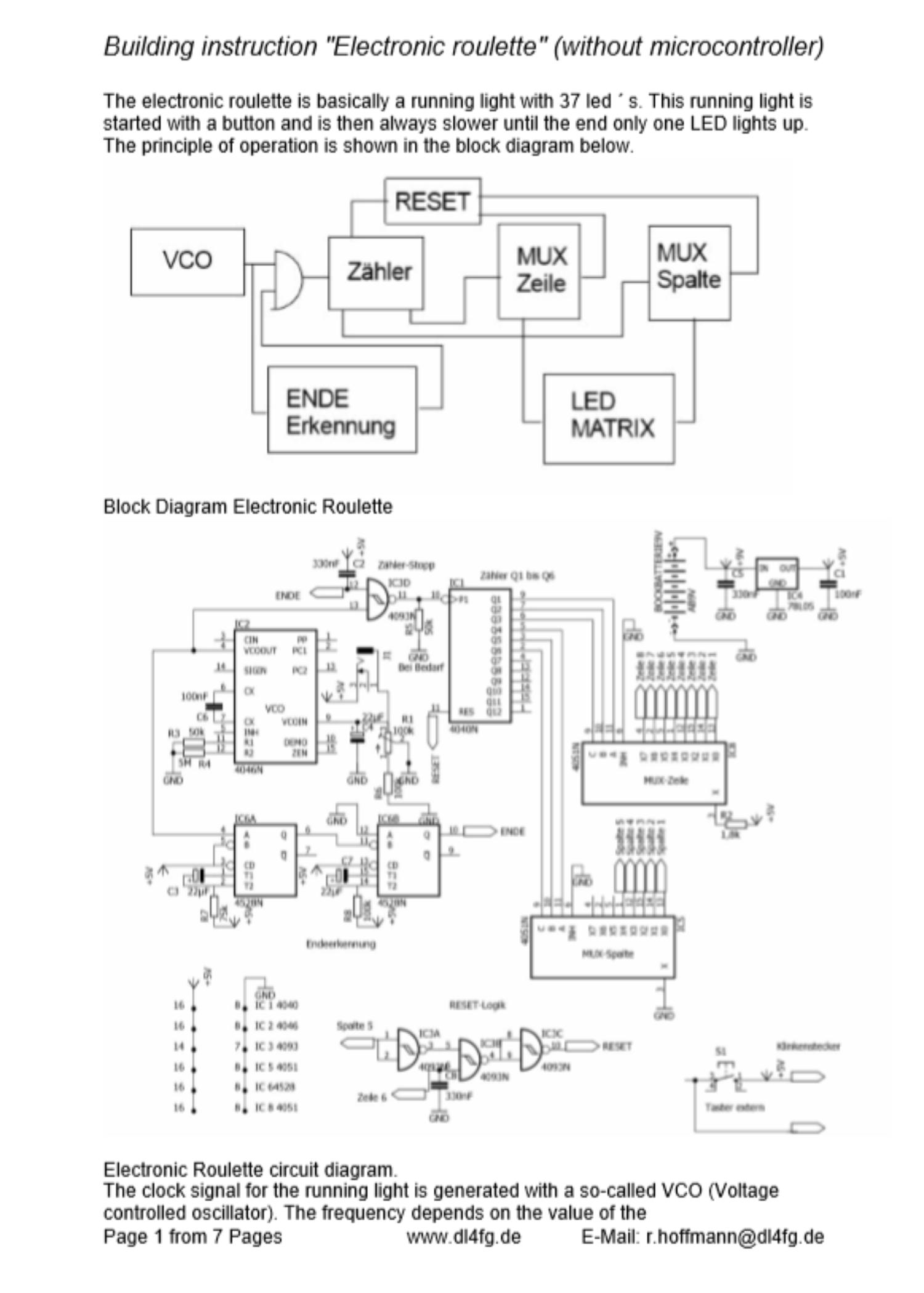 The electronic roulette is basically a running light with 37 led ´ s. This running light is started with a button and is then always slower until the end only one