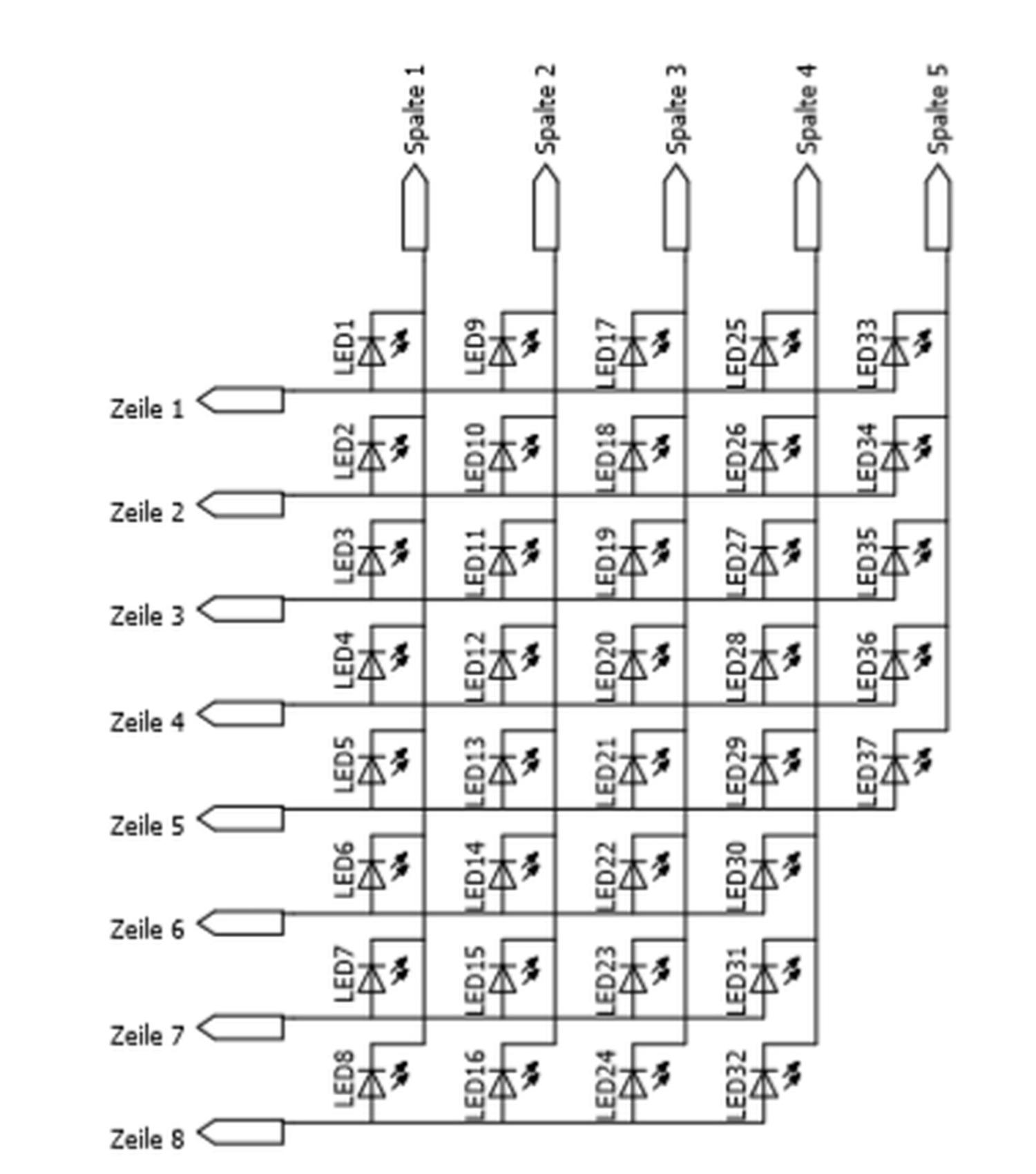 The next page shows the circuit diagram of the LED matrix. It is important for diodes that they are led ´s with 2 mA power requirements. At led ´ S 20